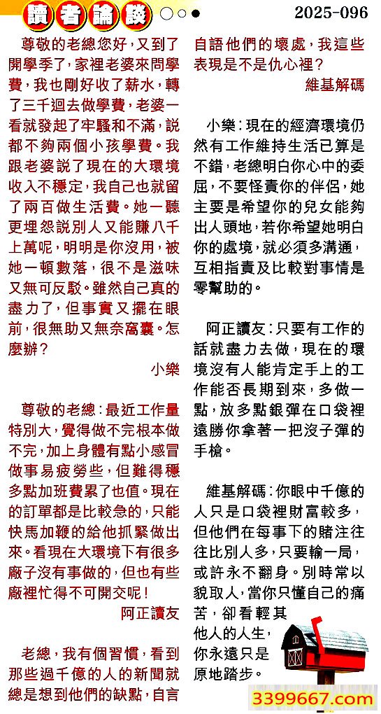 | 主题 :096期:彩民推荐〖貼信讀者論壇〗 |