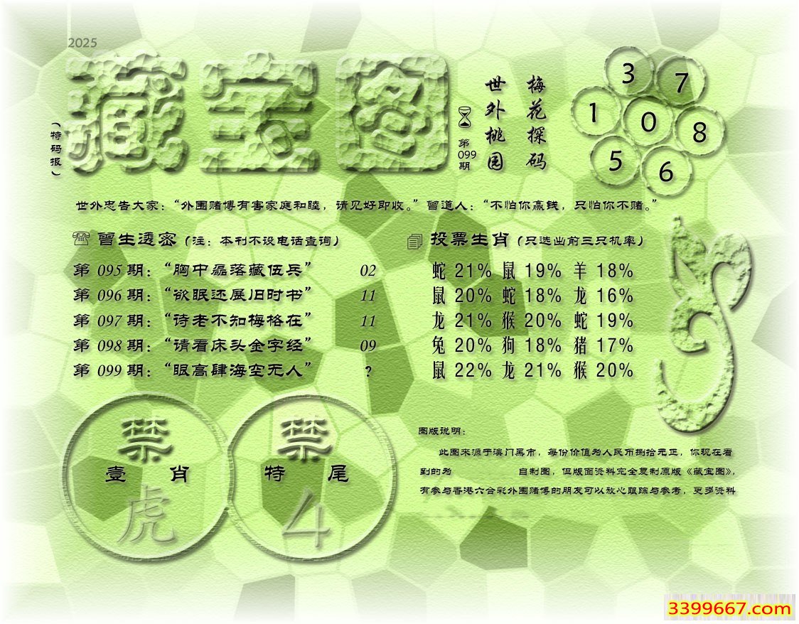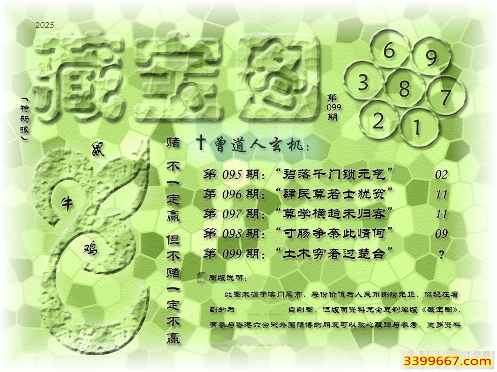 | 主题 :099期藏寶圖 新:土木穷奢过楚台 老:眼高肆海空无人 禁:虎 禁:4尾 |