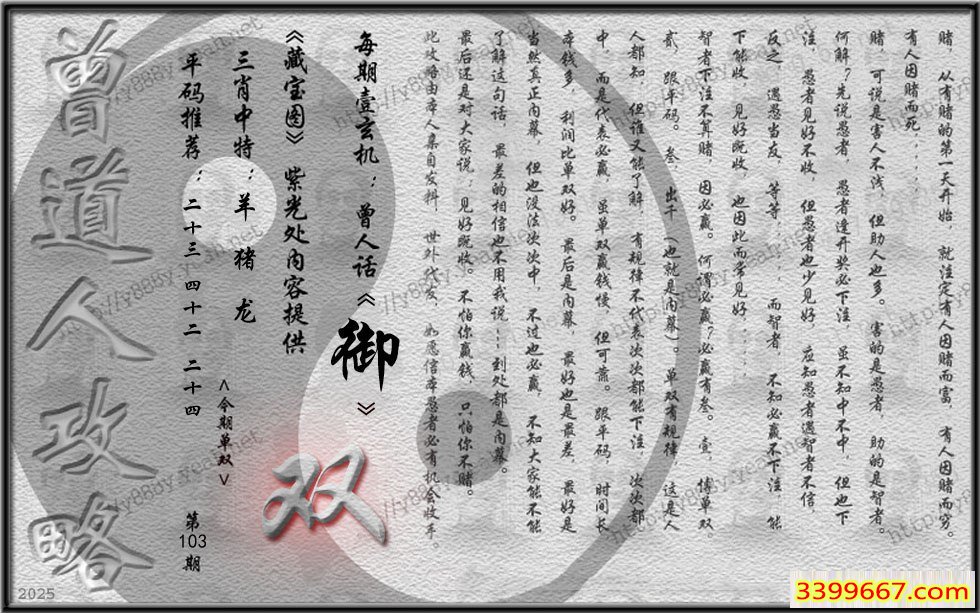 | 主题 :103期藏寶圖 新:花鲜绚日猩红妒 老:闻道潮头壹丈高 禁:蛇 禁:9尾 |