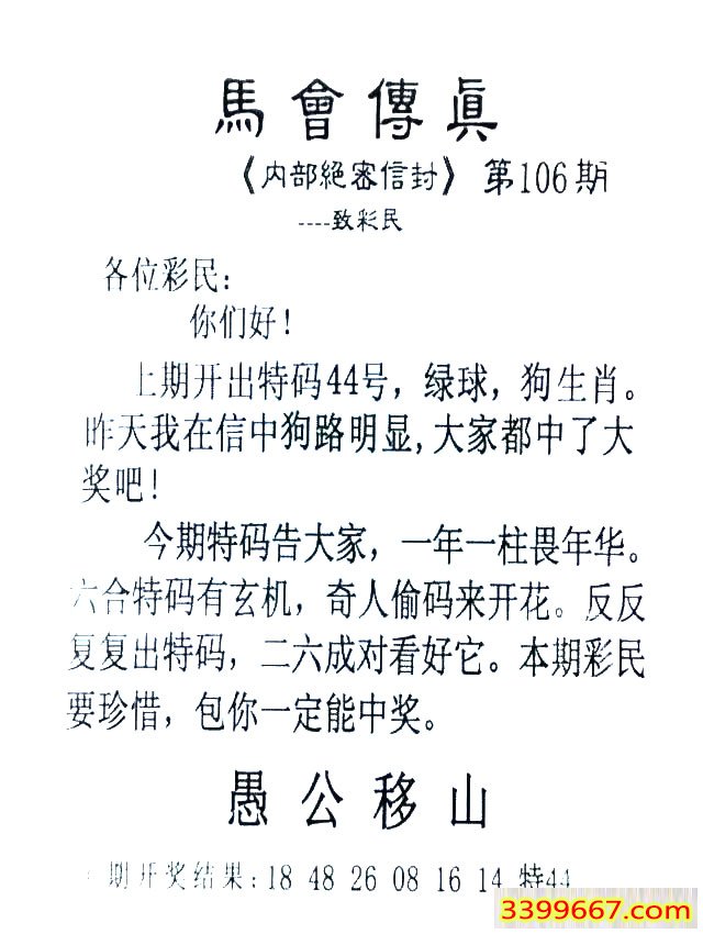 | 主题 :106期:首发推荐:≮馬會傳眞≯→(香港正版) |