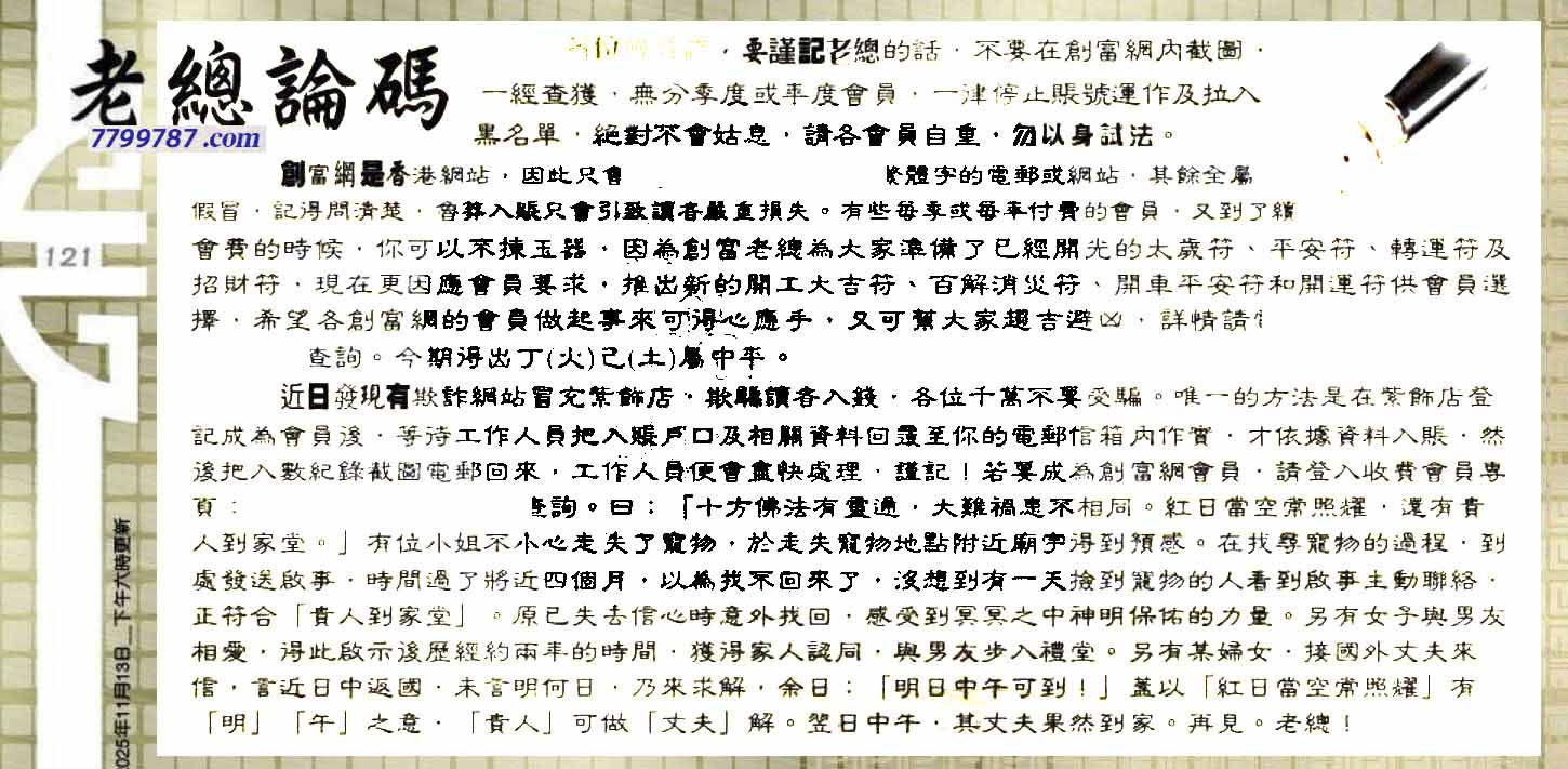 | 主题 :121期:六合皇金句/老总论码/萧公子/林大师/五行夺码/老总信箱截 |