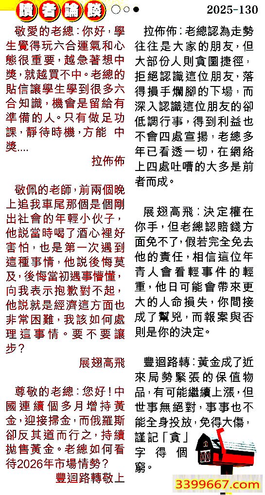 | 主题 :130期:彩民推荐〖貼信讀者論壇〗 |