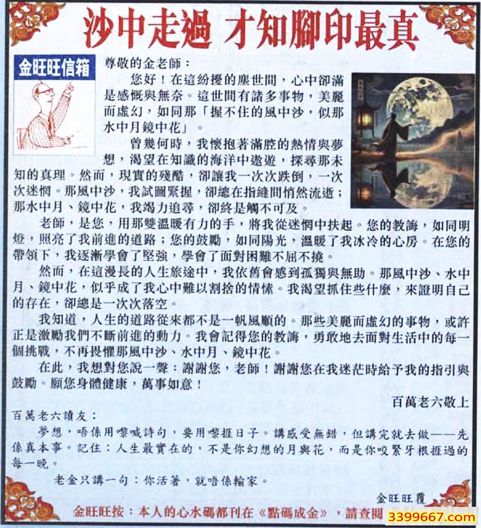 001期:金旺旺信箱彩民推荐→→《沙中走過 才知腳印最真》